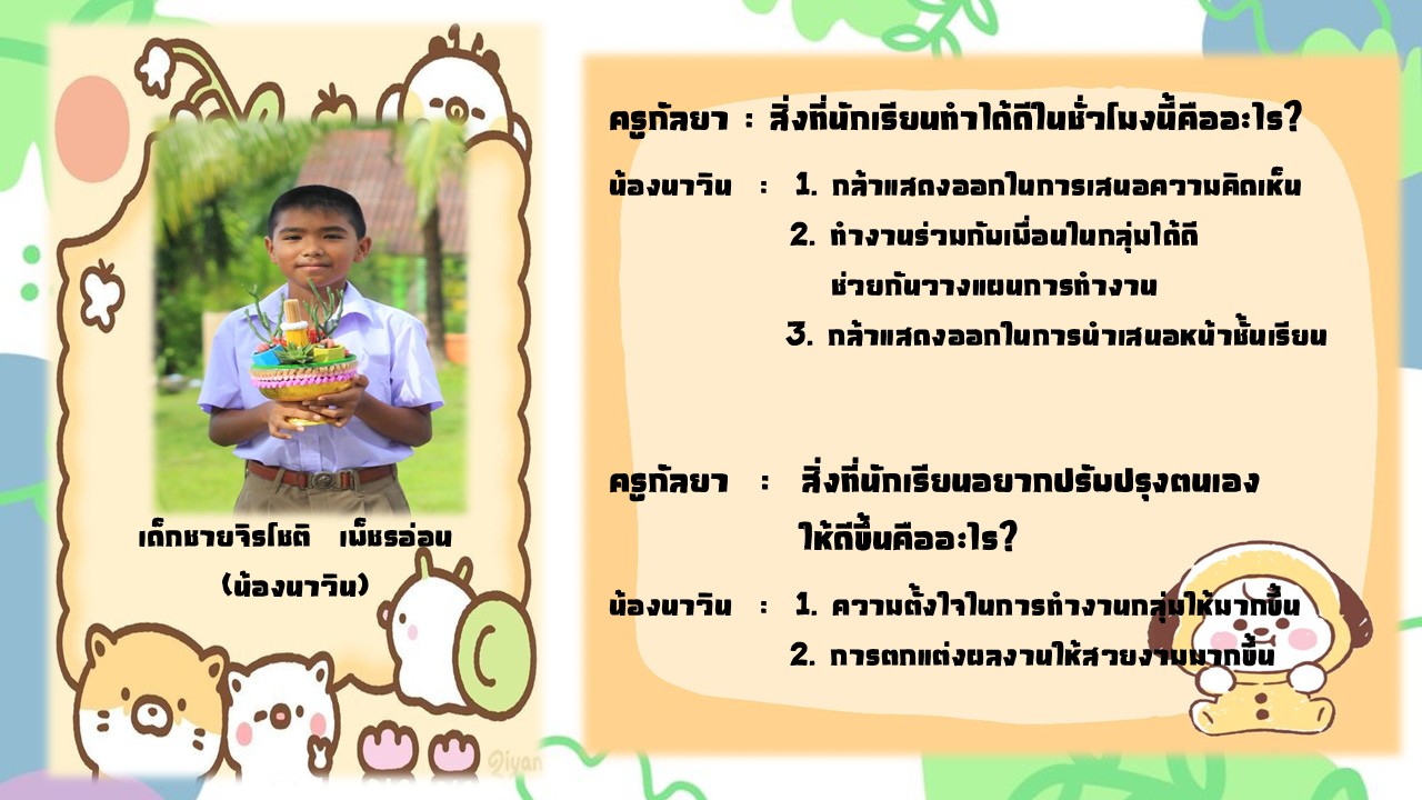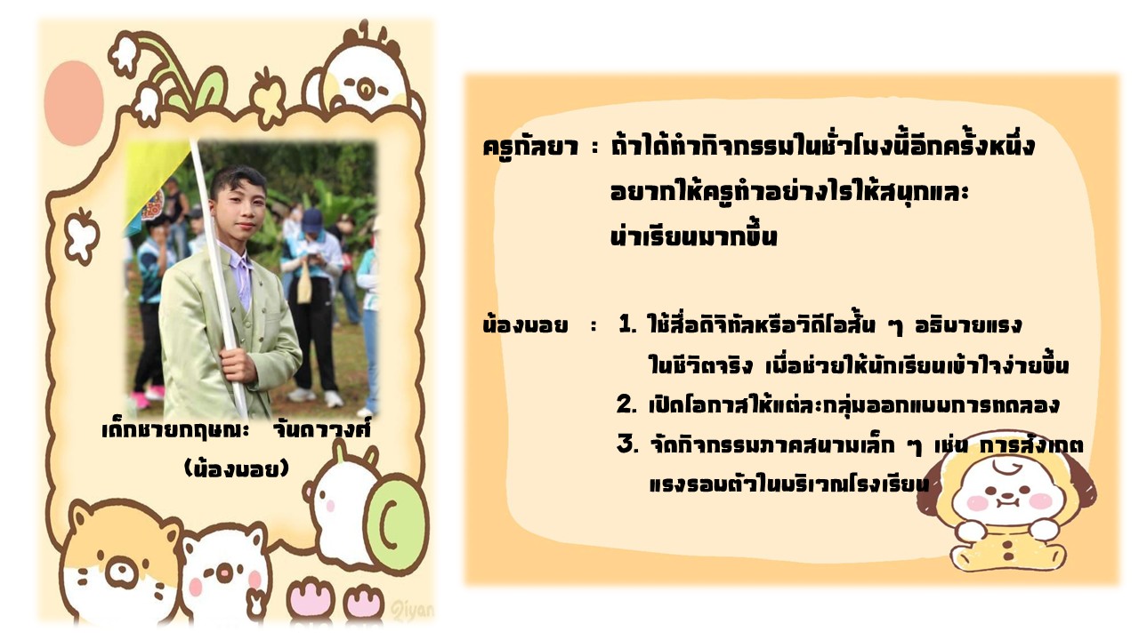 คุณครูเลือกสุ่มนักเรียนจำนวน 2 - 3 คน จากการจัดกิจกรรมการเรียนการสอนในครั้งนี้ เพื่อเป็นการสะท้อนคิดของนักเรียน