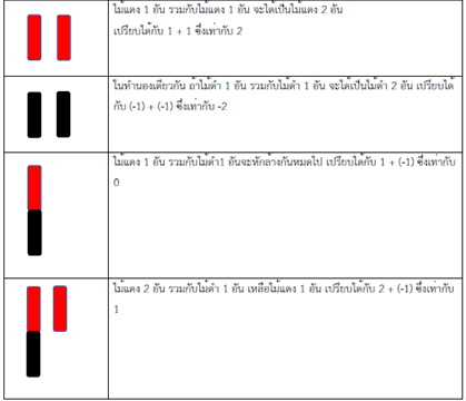 6. ครูกำหนดให้ผู้เรียนฝ่าย ก ตั้งโจทย์การบวกระหว่างจำนวนเต็มบวกและจำนวนเต็มลบที่มีจำนวน เต็มบวกไม่เกิน 20 และจำนวนเต็มลบไม่น้อยกว่า -20 แล้วให้นักเรียนฝ่าย ข หาคำตอบ โดยใช้แนวคิด เช่นเดียวกับชาวจีนในสมัยโบราณ โดยใช้ไม้ไอศกรีมแทนไม้สีต่าง ๆ ของชาวจีน