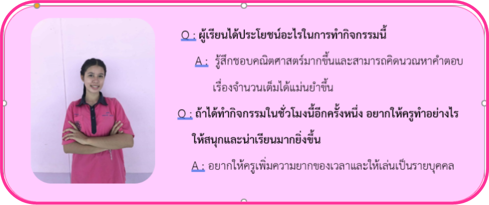 2. ผู้เรียนออกมาล้วงกล่องปริศนา โดยกล่องนั้นจะมีกระดาษโจทย์การบวกลบจำนวนเต็ม เมื่อผู้เรียนได้กระดาษคำถามแล้ว ให้ผู้เรียนคิดหาคำตอบ ใครที่ได้คำตอบเป็นจำนวนเต็มบวกให้อยู่กลุ่ม ก. ใครที่ได้คำตอบเป็นจำนวนเต็มลบให้อยู่กลุ่ม ข.โดยมีทีมผีเสื้อว่องไว ค่อยช่วยเหลือเพื่อนที่คิดช้า(ทักษะเพื่อนช่วยเพื่อนในห้องเรียน)