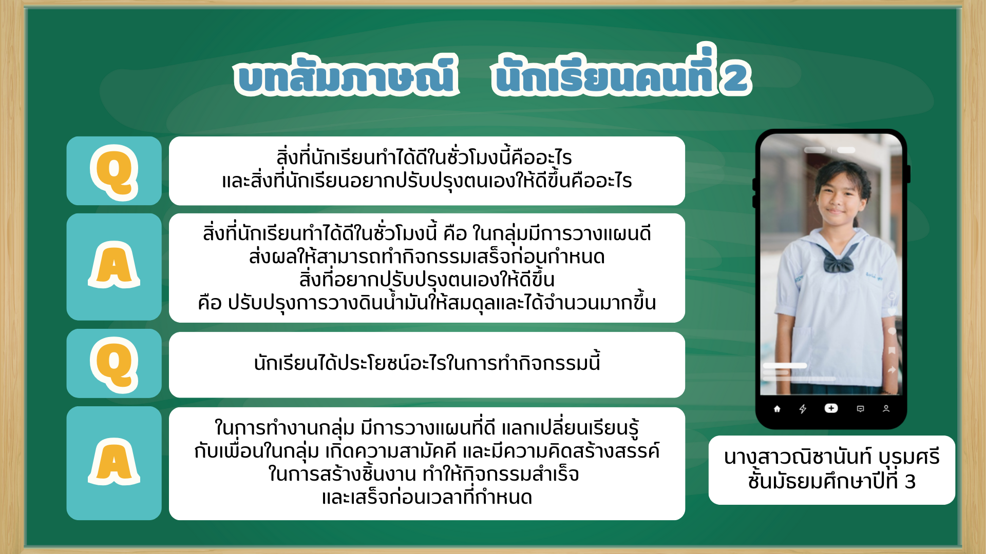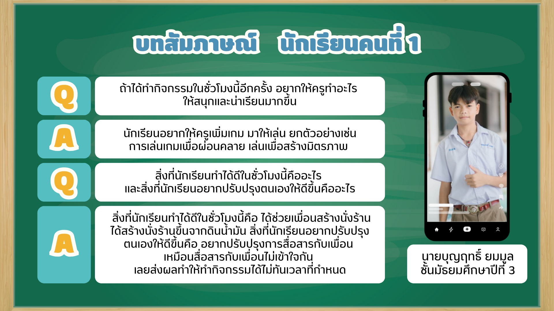 ประเด็นที่ 4 เลือกสัมภาษณ์นักเรียน 2 คน ในห้อง เลือกตอบ 2 คำถาม