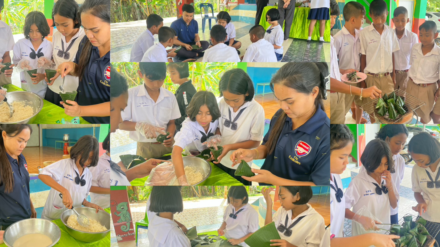 นักเรียนลงมือทำข้าวเหนียวปิ้งด้วยตัวเอง เรียนรู้การเตรียมข้าว ห่อใบตอง และปิ้งบนเตาถ่าน ผ่านการทำงานร่วมกันอย่างสนุกและมีความหมาย