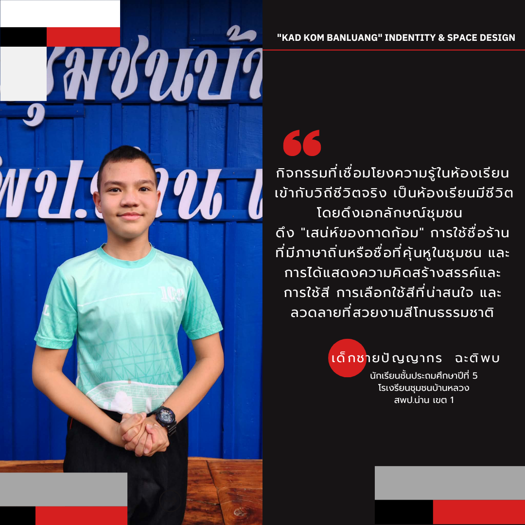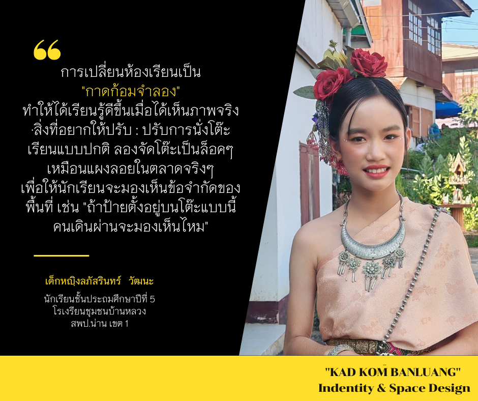 "KAD KOM ฺBANLUANG" Indentity & Space Design" ห้องเรียนมีชีวิต “กาดก้อม” การจัดการเรียนรู้ที่เปลี่ยนห้องเรียนให้เชื่อมโยงกับชุมชน ตลาด และวิถีชีวิตจริง ผู้เรียนได้เรียนรู้จากประสบการณ์ตรง ผ่านการลงมือคิด ทำ แก้ปัญหา และสร้างผลงานจริง กาดก้อมทำหน้าที่เป็นแห่งเรียนรู้ที่ผู้เรียนได้บูรณาการความรู้หลายกลุ่มสาระ เช่น ภาษาไทย คณิตศาสตร์ วิทยาศาสตร์ สังคม ศิลปะ และการงานอาชีพ เพื่อใไห้ได้ผลลัพท์ของการเรียนรู้ เปิดมุมมองในการเรียนรู้ ผู้เรียนมีทักษะชีวิตและทักษะอาชีพ เรียนรู้คุณค่าท้องถิ่นและเกิดความภาคภูมิใจในผลงานองตนเอง โรงเรียน ชุมชน และผู้มีส่วนร่วมอย่างแท้จริง
