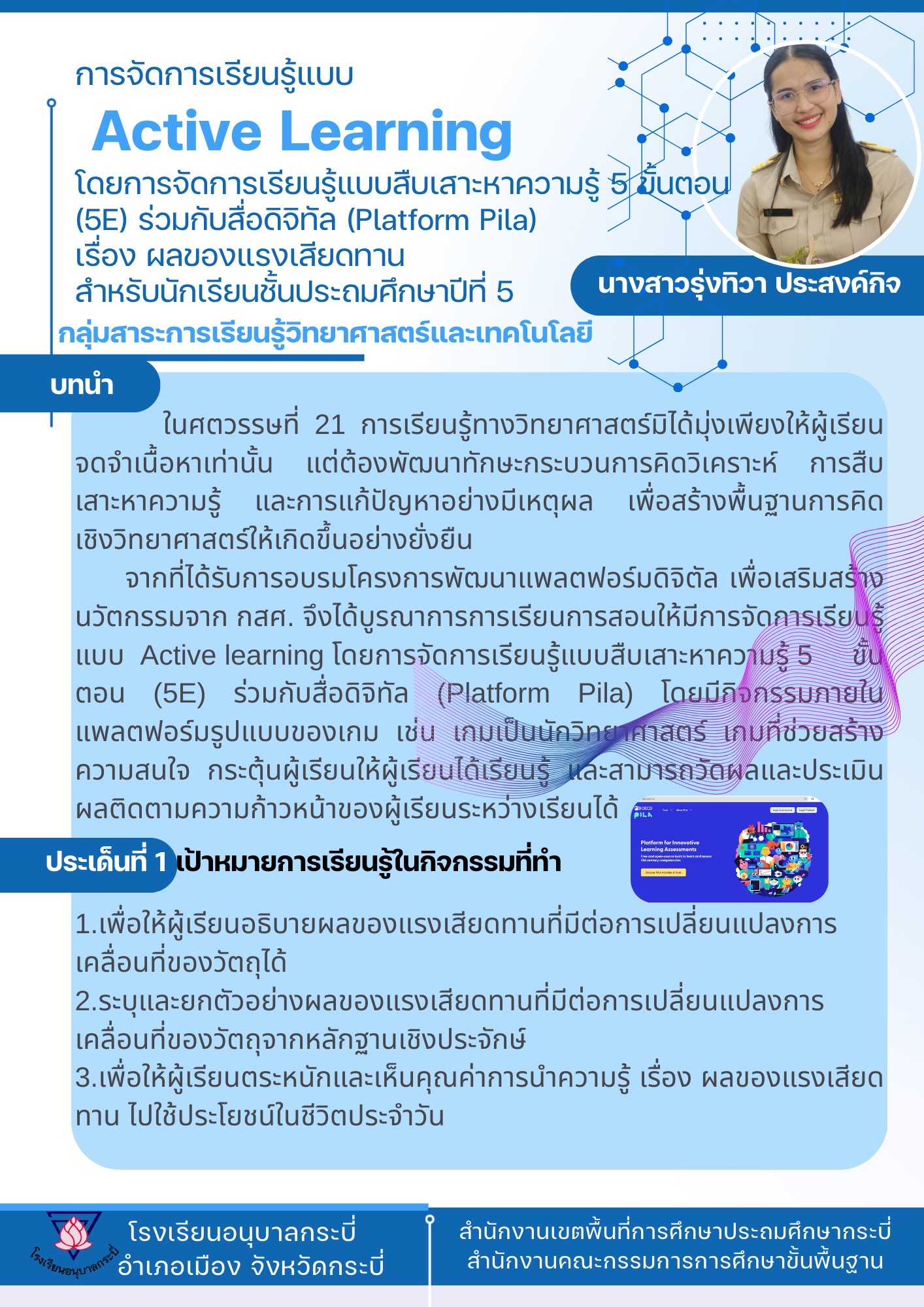การจัดการเรียนรู้แบบ Active Learning โดยการจัดการเรียนรู้แบบสืบเสาะหาความรู้ 5 ขั้นตอน ร่วมกับสื่อดิจิทัล (Platfrom Pila) เรื่อง ผลของแรงเสียดทาน สำหรับนักเรียนชั้นประถมศึกษาปีที่ 5 กลุ่มสาระการเรียนรู้วิทยาศาสตร์และเทคโนโลยี